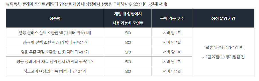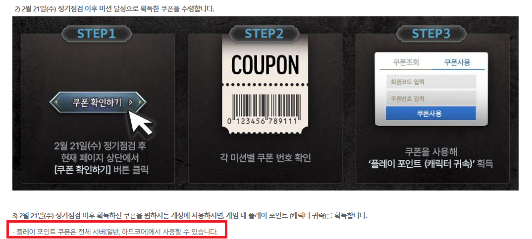보면 플레이 포인트 쿠폰은 전체 서버(일반,하드코어)에서 사용할 수 있다라고 적혀 있어서 부케나 다른계정으로 키우는 사람이 있는데 이렇게 하면 절대 안된다.
