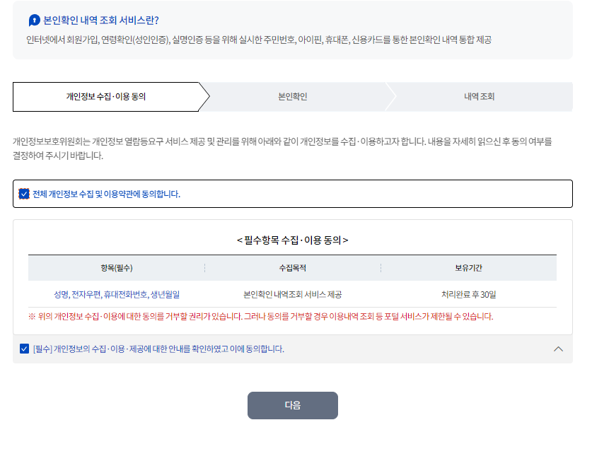 위 사이트 가서 동의 하고 다음 눌러서 개인 인증하고 나면