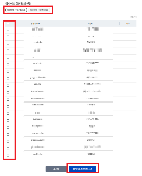 탙퇴 가능한 사이트와 탈퇴 불가능 한 사이트로 나눠지고 탈퇴 가능한 사이트는 체크 하고 탈퇴 신청하면 한번에 탈퇴가 가능하다.