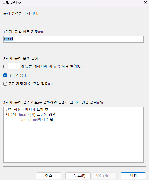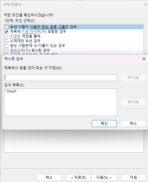 테스트로 제목에 지정 단어(cloud)가 포함된 경우 로 선택을 하고 다음
