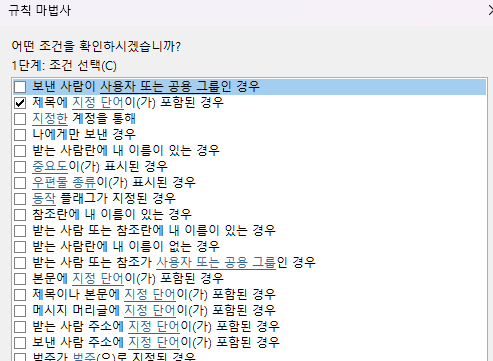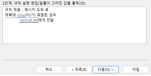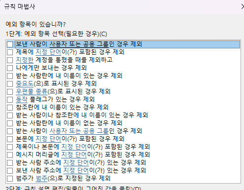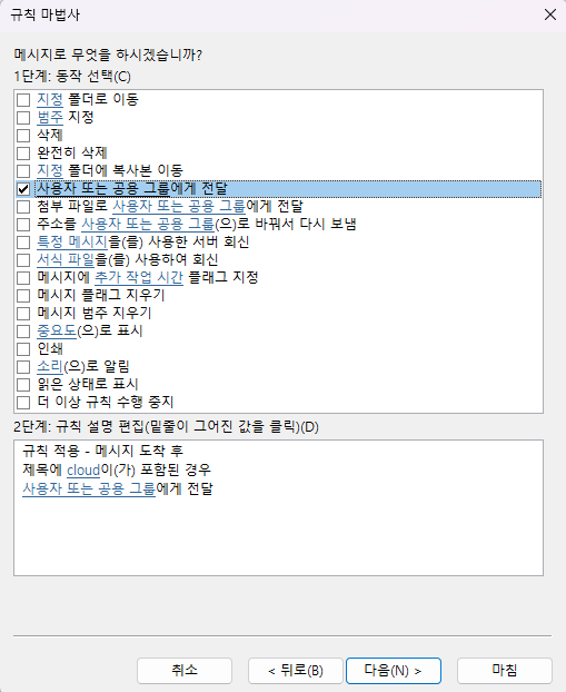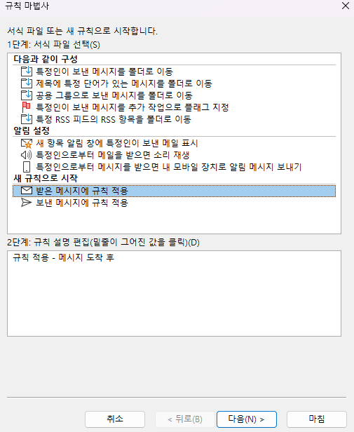 받은 메시지에 규칙 적용으로 선택 하고 다음