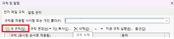 아무 메일에 마우스 오른쪽 버튼을 누르면 규칙 및 알림 관리에 들어갈수 있다.