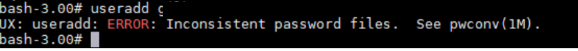 UX: useradd: ERROR: Inconsistent password files. See pwconv(1M).