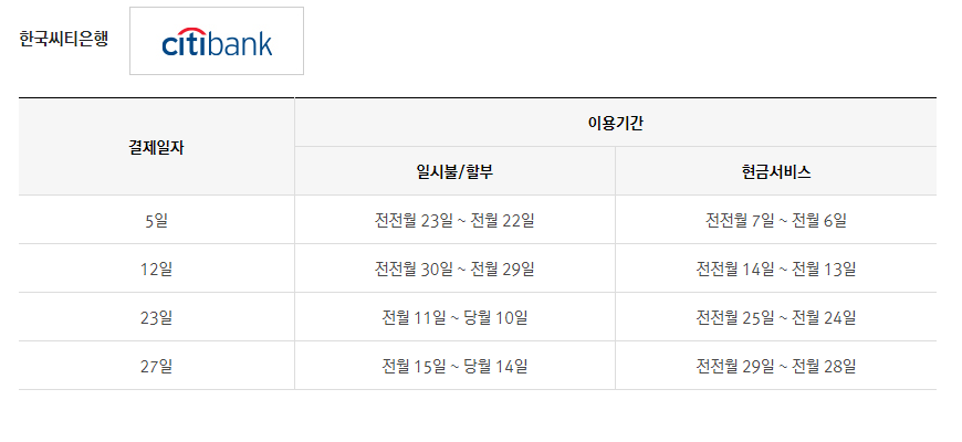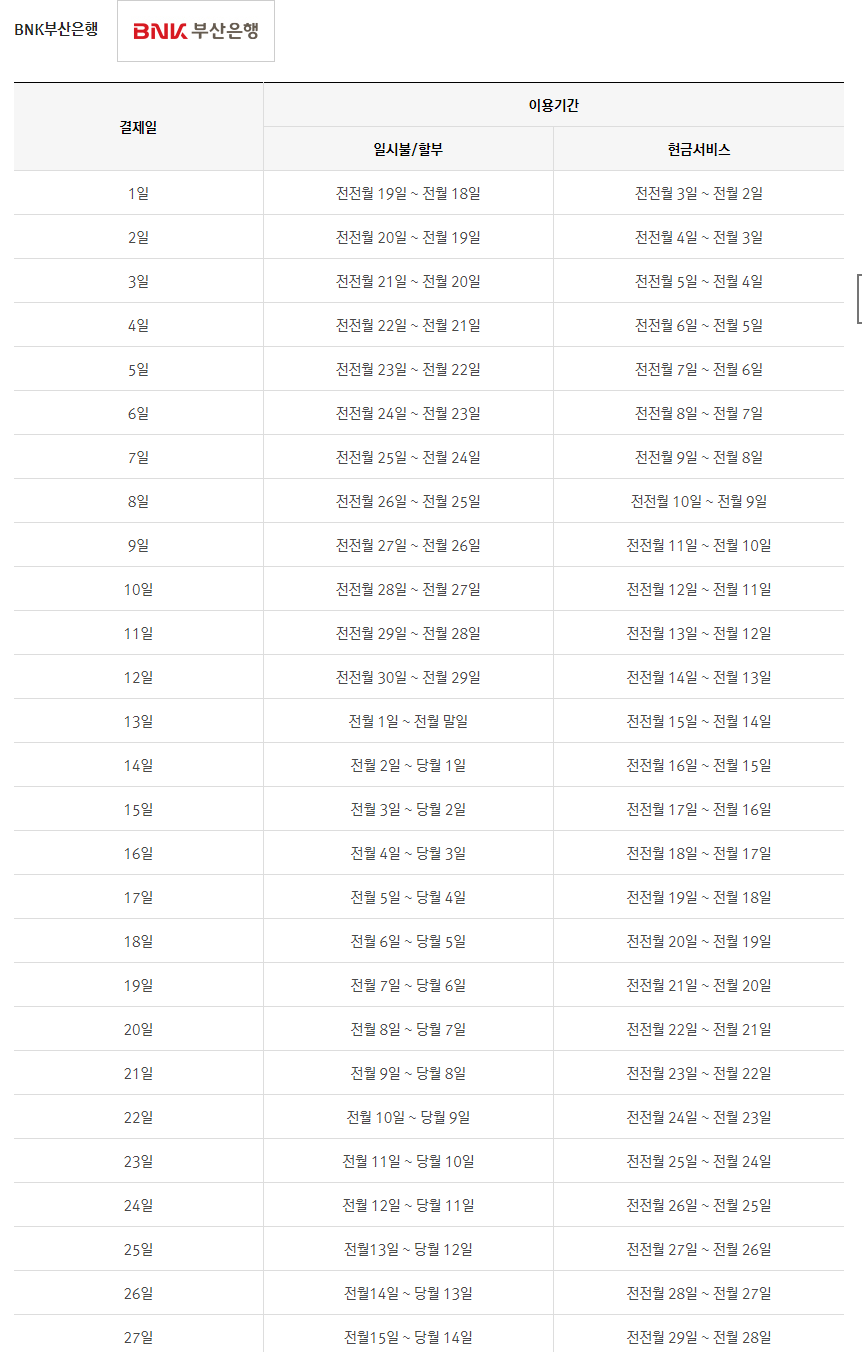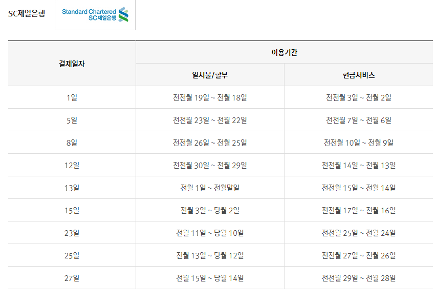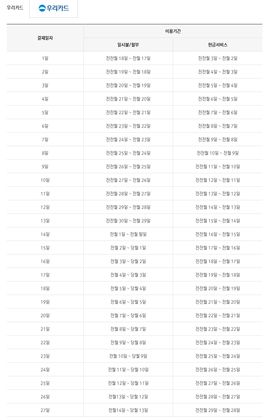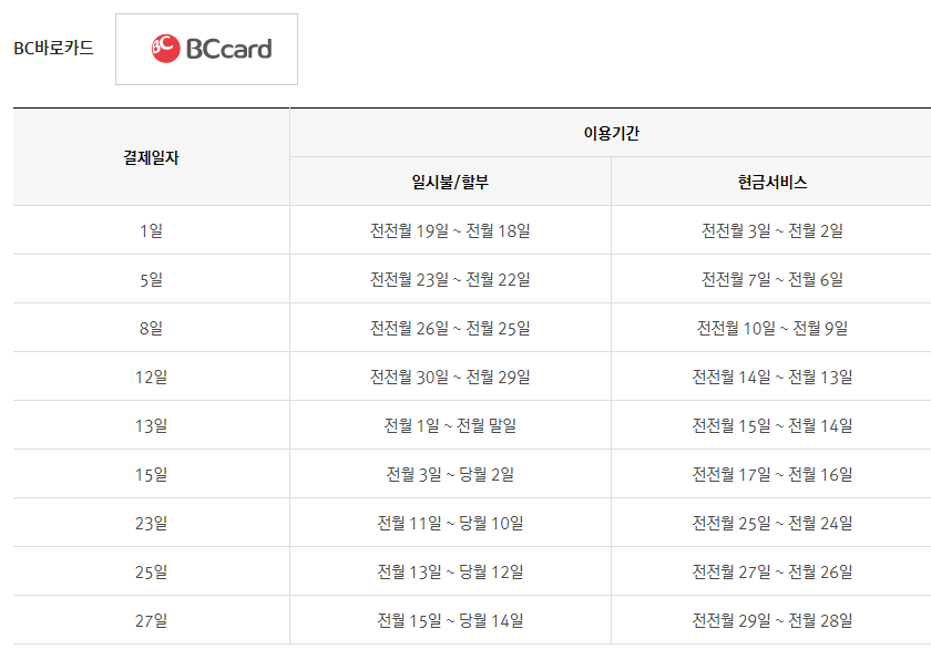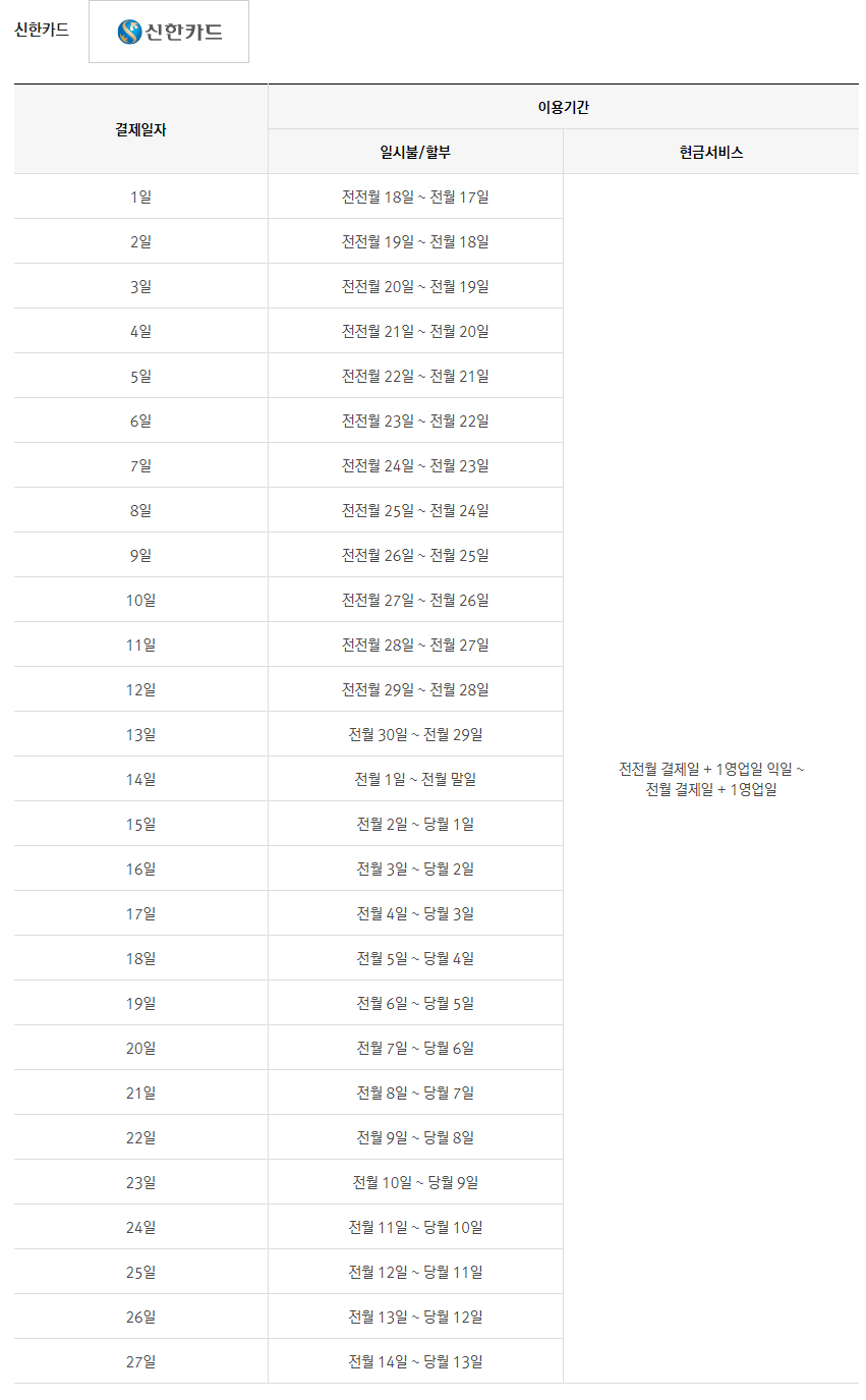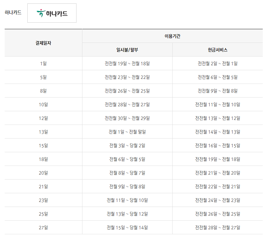 카드 결제일 마다 사용기간이 카드사 마다 다르다. 혜택을 받기 위해 자신의 결제 일자별 사용 기간을 잘 체크해서 사용하자.