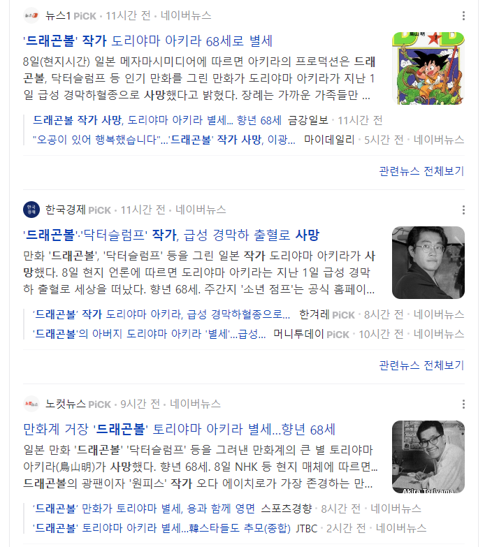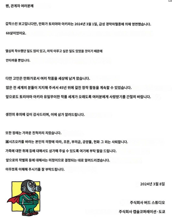 2024년 3월 8일 트위터 하나가 올라왔는데 드래곤볼 작가 토리야마 아키라 사망 소식이 올라왔다.