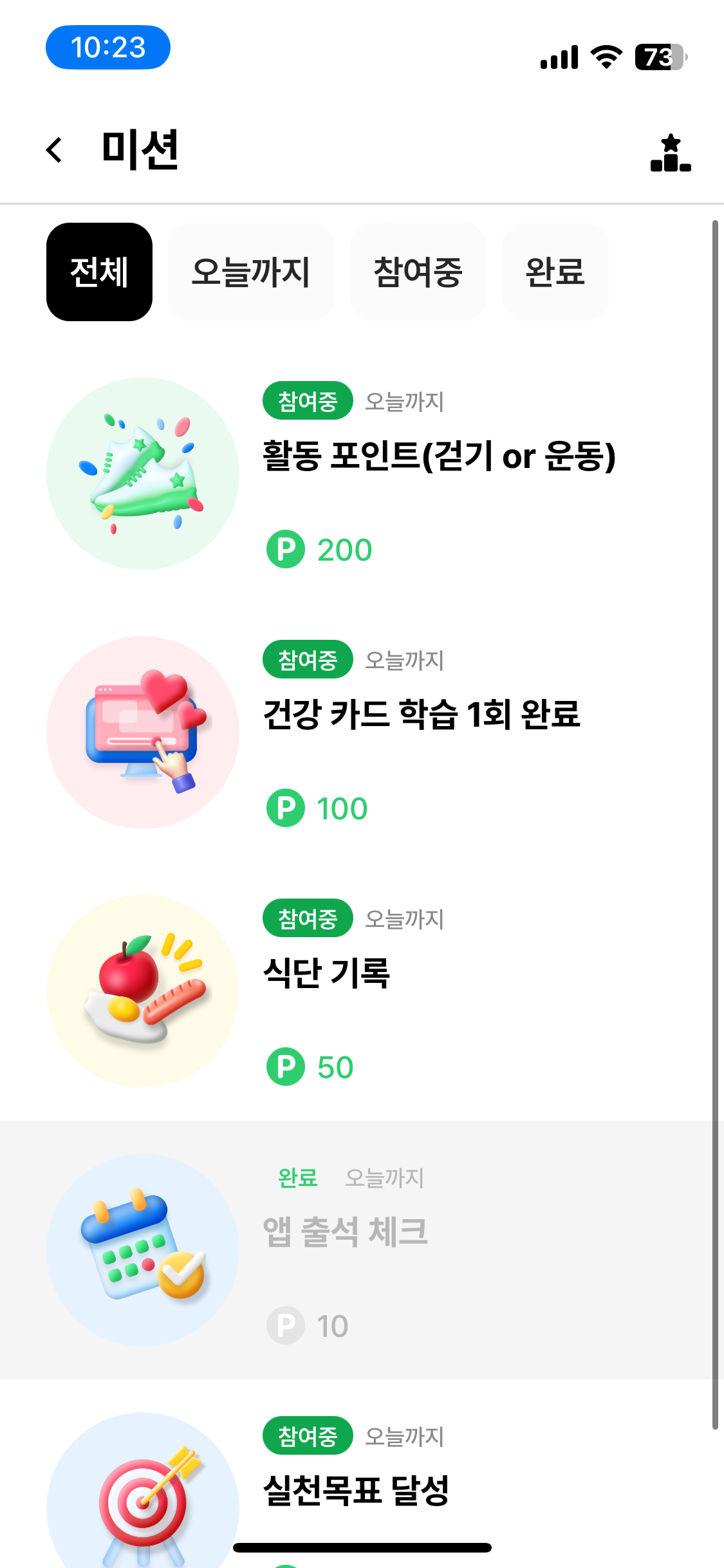 캐시워크 처럼 여러가지 미션이 있고 미션 달성시 포인트를 획득이 가능하다.