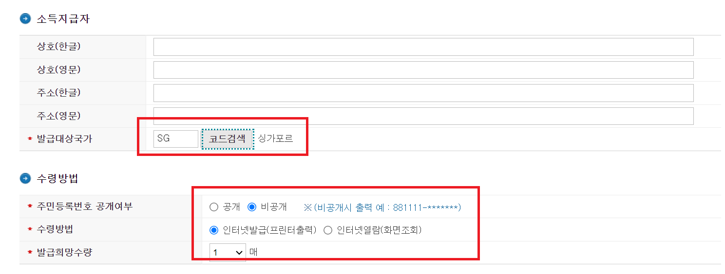 발급대상국가가 있으니 싱가포르 선택 하고 아래는 위와 같이선택 하자