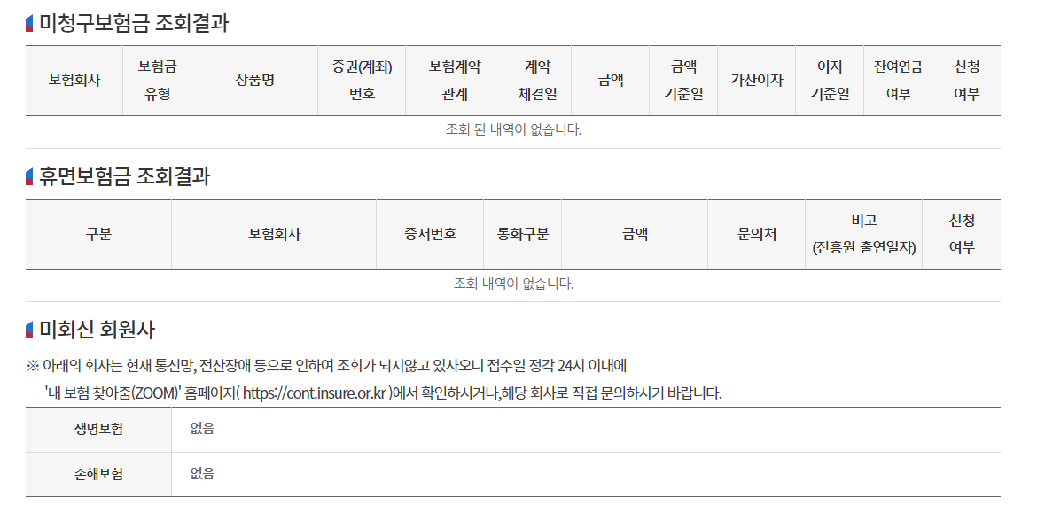 미청구보험금 조회도 가능하다. 난 미청구 보험금이 없다