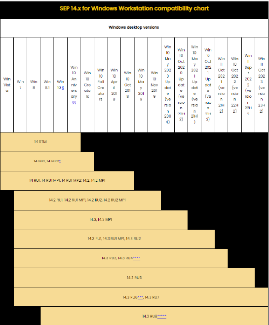 Depending on the version of Symantec Endpoint Protection (SEP), SEP supports Windows 11 through Windows Vista, and Server 2022 through 2008. Use the grids below to identify what version of SEP supports your operating system. Note: Specific product versions