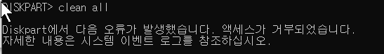 diskpart 에서 clean all 명령을 해도 액세스 거부로 인해 삭제도 안된다.
