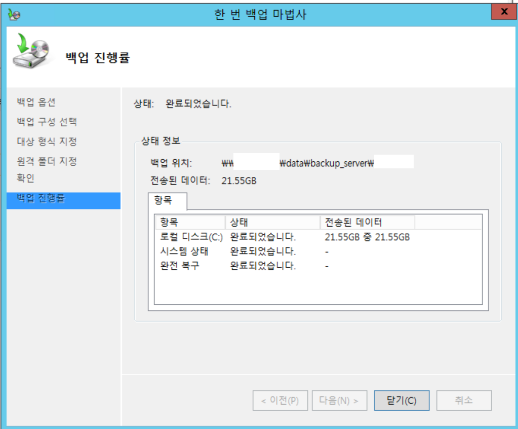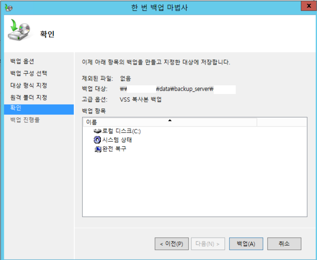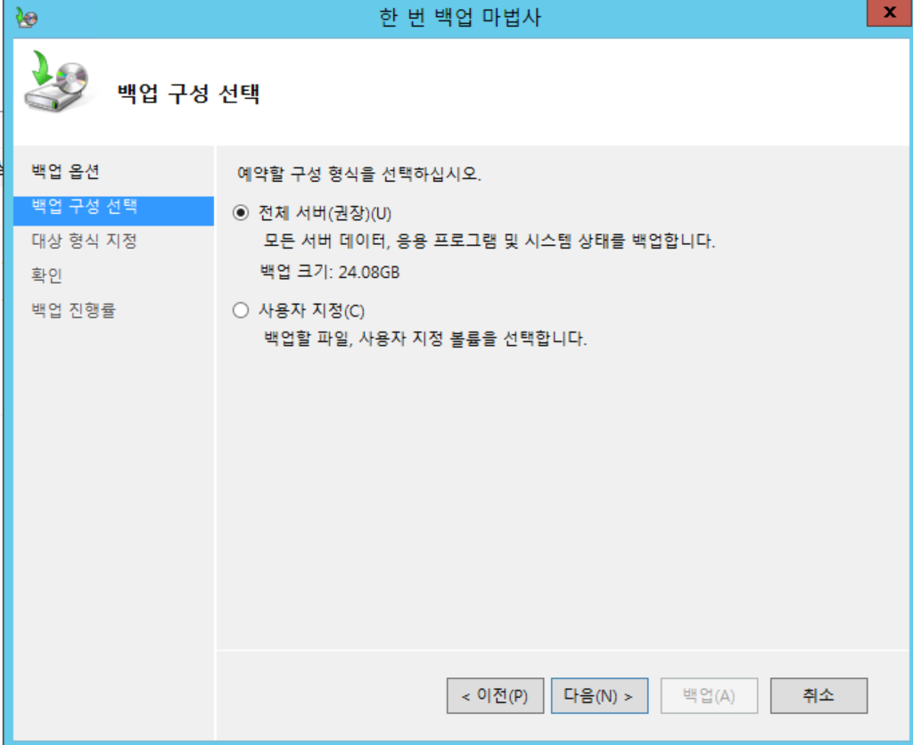 전체 서버 선택을 하자 뭐 사용자 지정 해도 되지만 윈도우 전체를 백업을 하는게 좋다. 백업 크기는 설정환경에 따라 용량이 다르다.