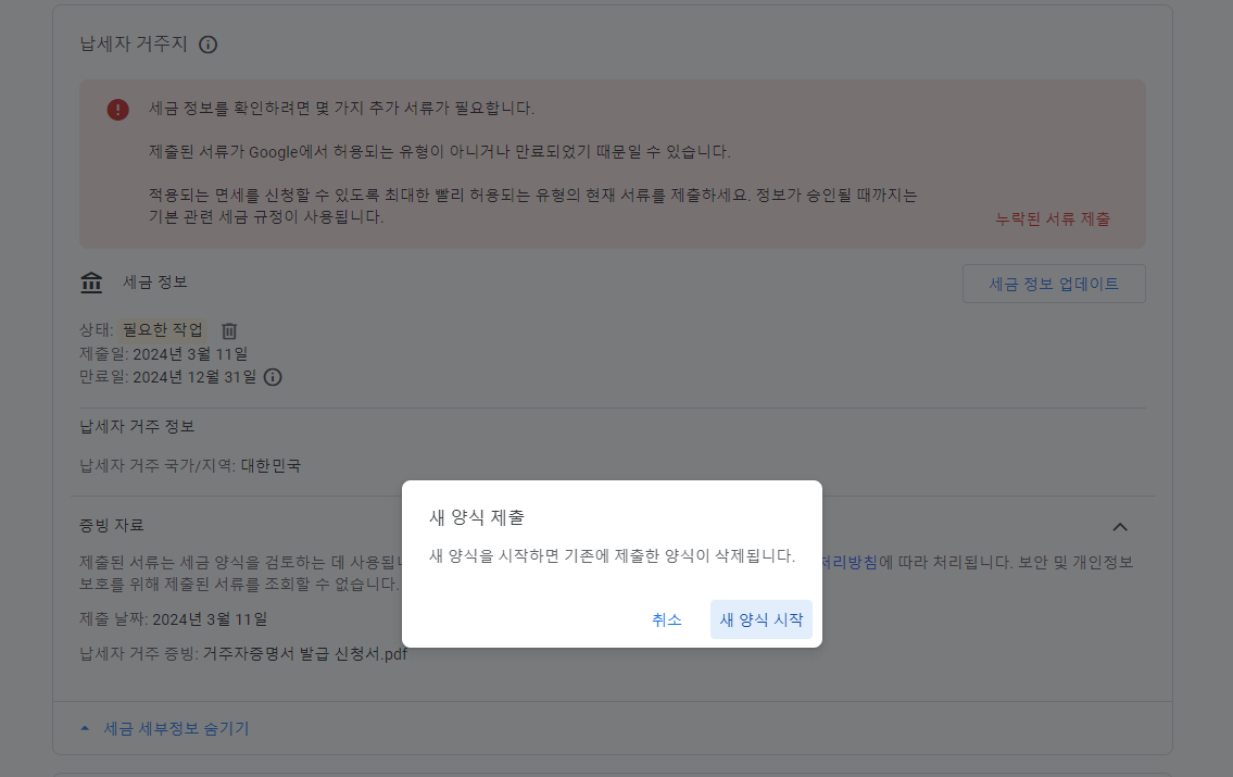 [애드센스] 세금 정보를 확인하려면 몇 가지 추가 서류가 필요합니다.