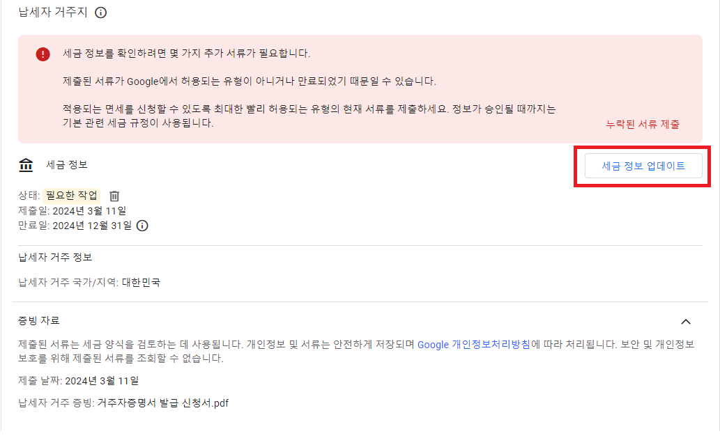 위와 같이 뜨면 세금 정보 업데이트를 눌러서 들어가면