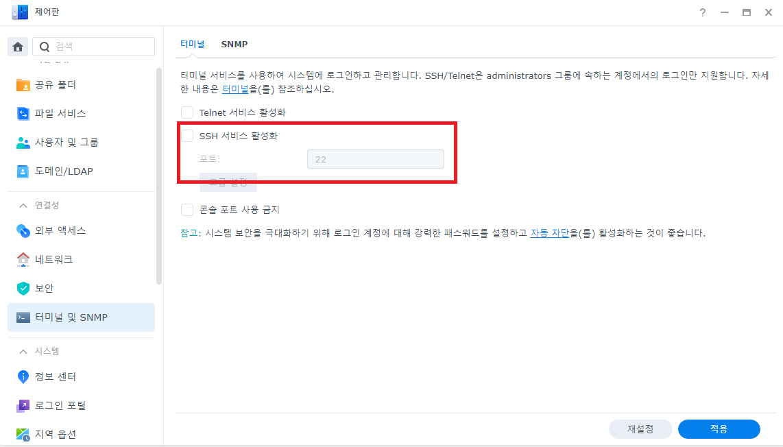 터미널 SSH 활성화 해주자. 그리고 SSH 로 접속