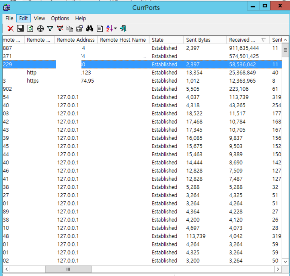sent bytes 와 received bytes 를 확인 할 수 있다.