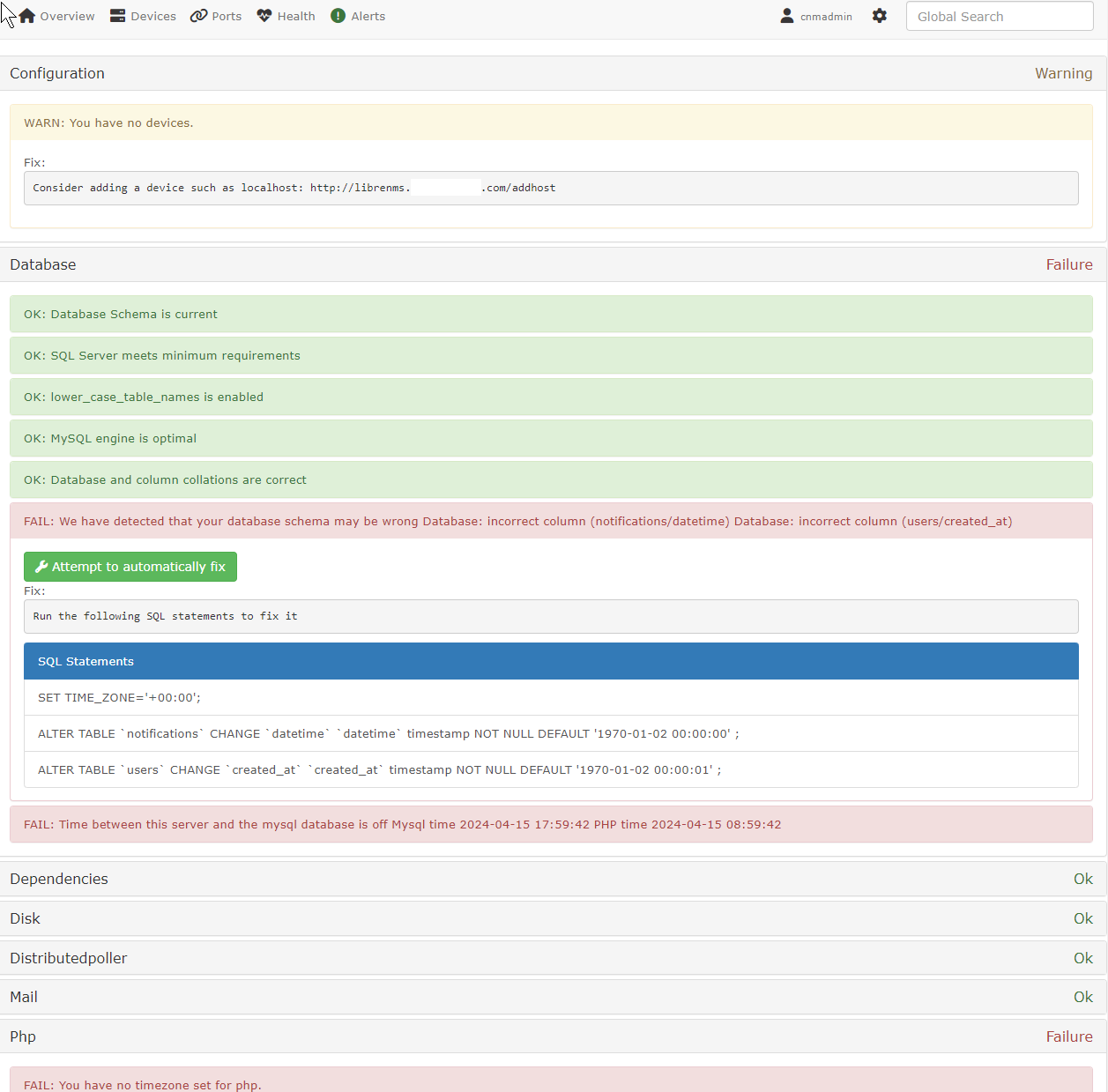 librenms 21버전은 php 7.x 에서 구동이 됐는데 최신 버전 24버전은 php 8.x 에 구동이 되서 업그레이드시 문제가 발생 한다. 디버깅 하기 귀찮아서 그냥 새로 설치를 했다.