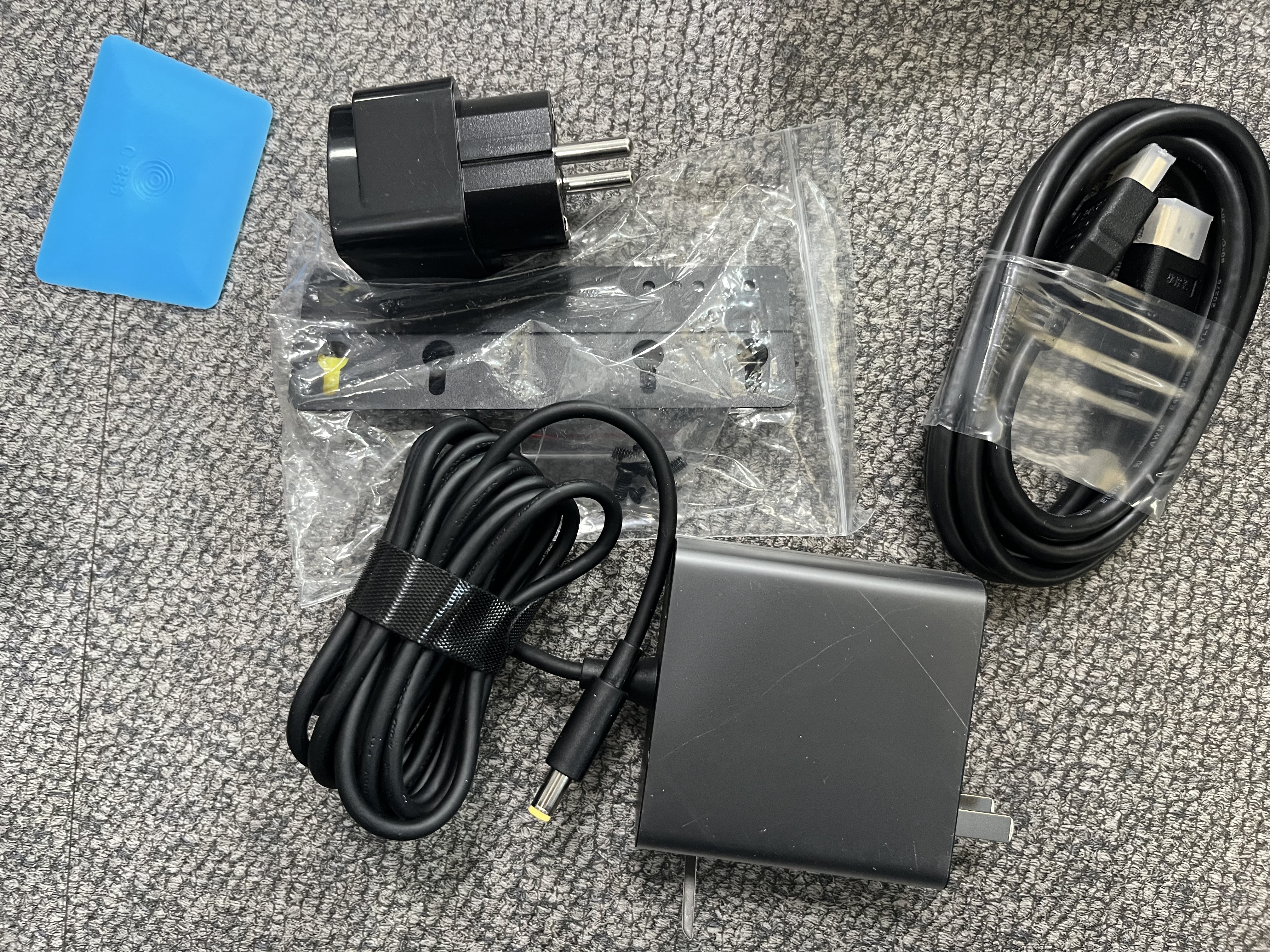 구성품 브라켓, 아답터, hdmi케이블, 110 to 220 젠더, 파란색 헤라?