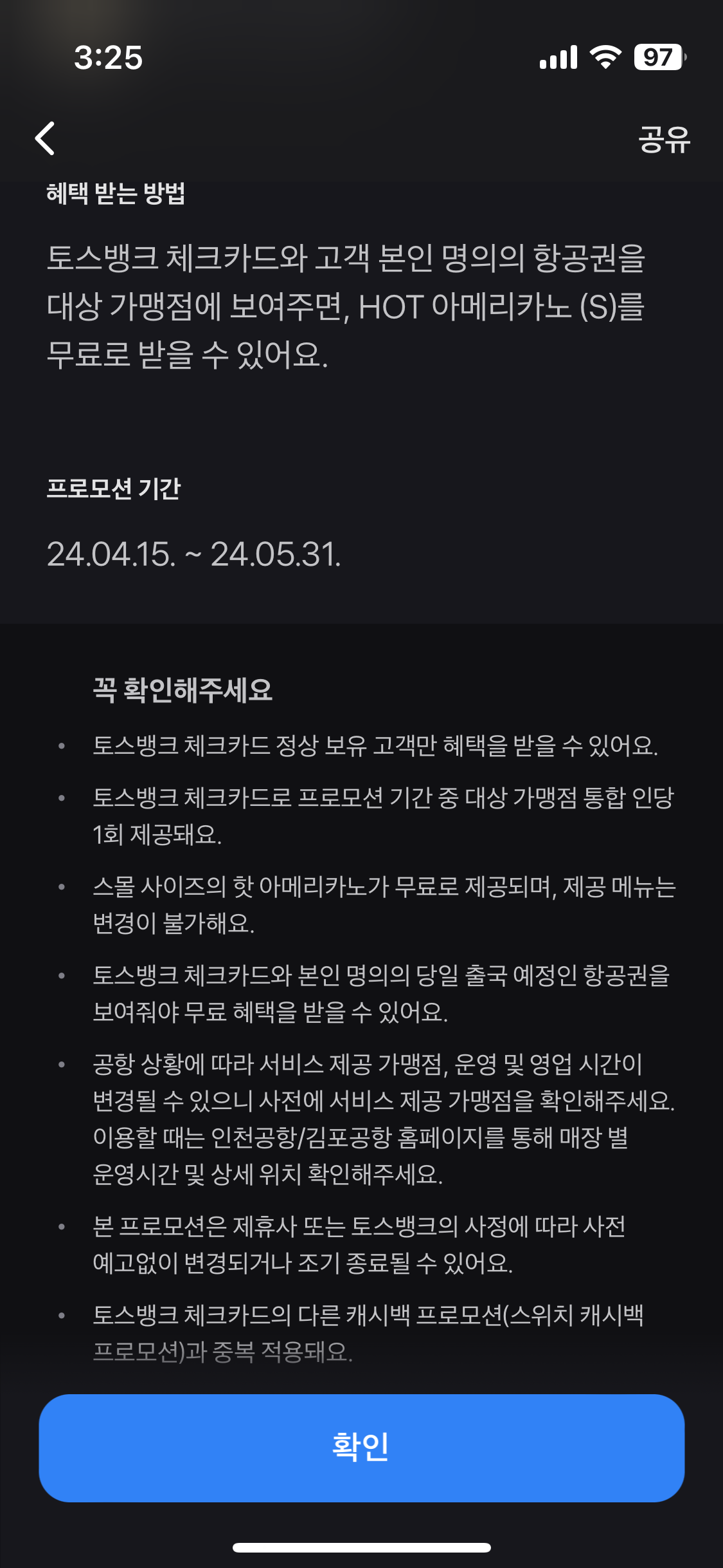 4월 15일부터 5월 31일까지고 1인당 1잔 항공권과 토스카드를 같이 보여줘야 한다.(메뉴변경불가)