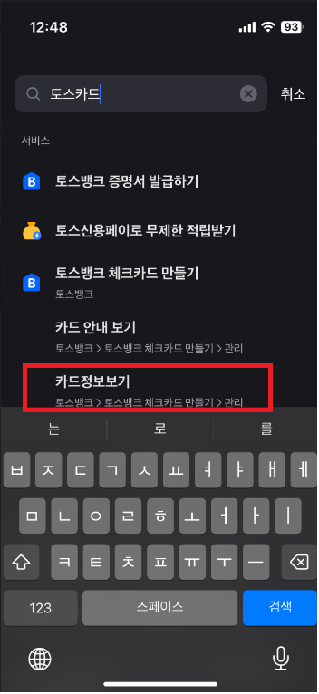 토스에 검색으로 카드정보보기를 누르면 카드 번호가 보인다.