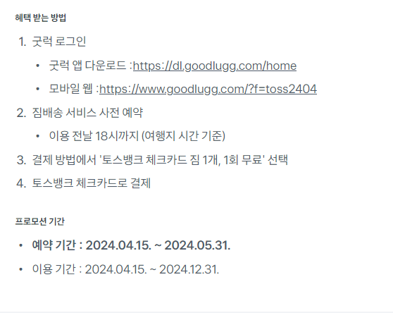 토스뱅크 체크카드로 결제시 굿럭 짐배송 1회 무료!! 이벤트중이다.