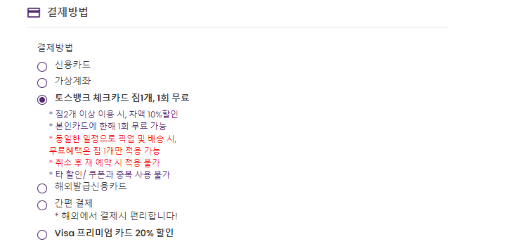 결제에 보면 토스뱅크 체크카드 짐1개, 1회 무료이다.