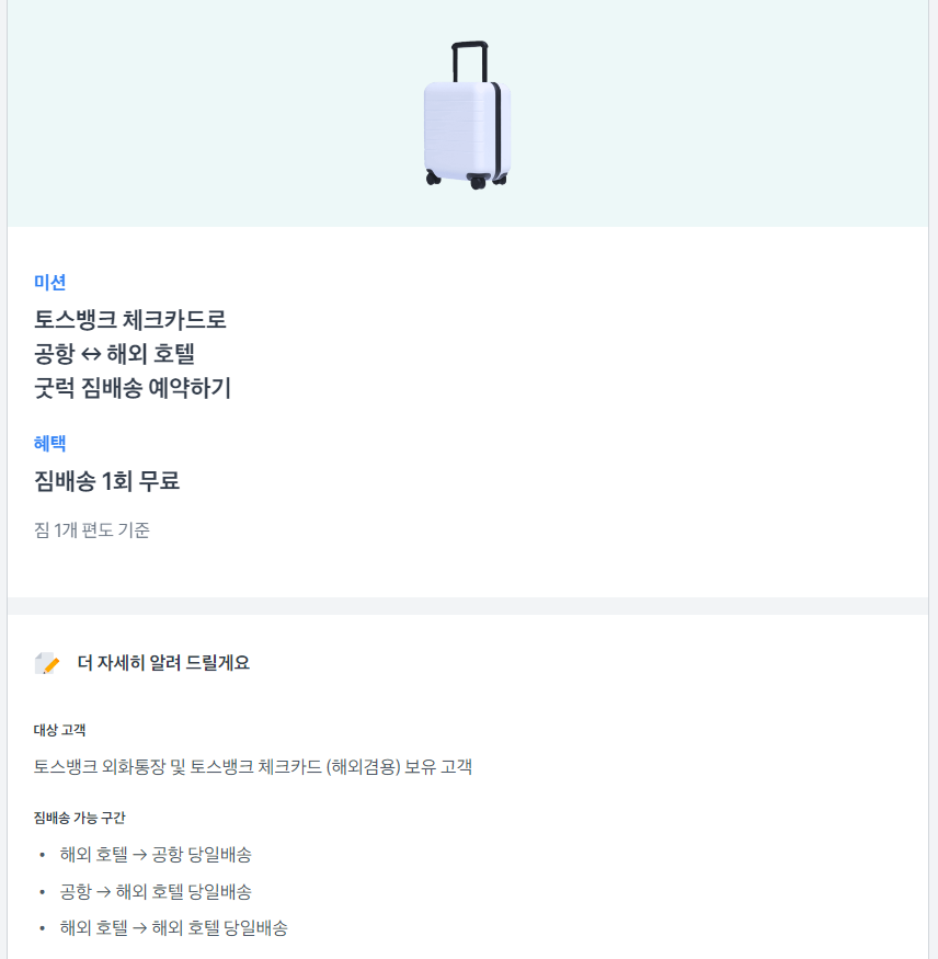 이럴때 케리어를 들구 다니거나 짐을 지하철 역같은곳에 맡기는것보다 이동할곳으로 미리 이동시키는게 좋은것 같아서 보고 있었는데 마침 토스에서 외환통장을 만들고 체크카드가 있다면 짐배송 1회가 무료이다. 실물카드가 없어서 카드 번호만 있으면 가능하다.