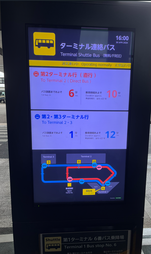 나리타 공항은 1,2,3터미널이 존재 한다. 터미널끼리 연결해주는 셔틀 버스들이 있는데 무료로 이용이 가능하다.