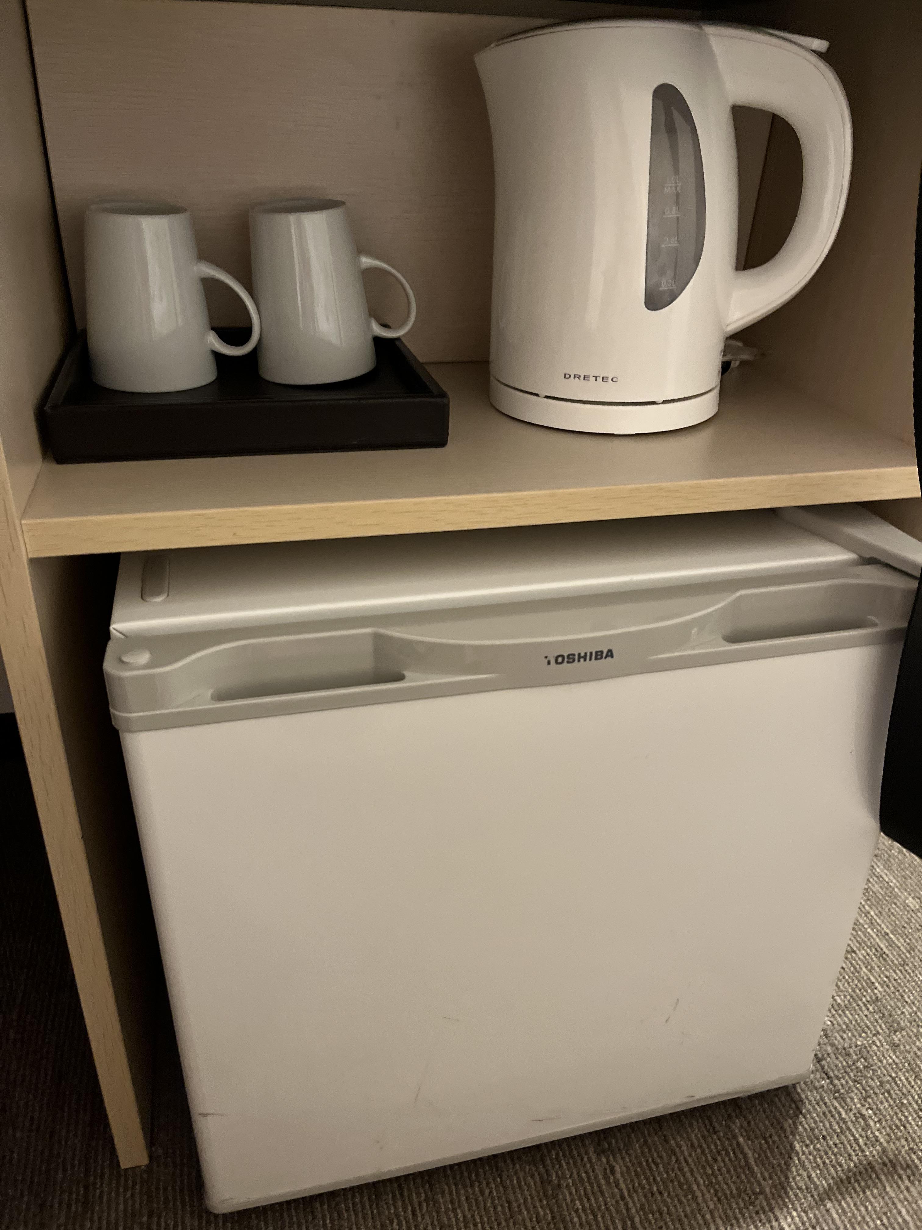 커피포트와 컵 냉장고 냉장고는 전원이 꺼져 있다 키고 사용해야 한다.