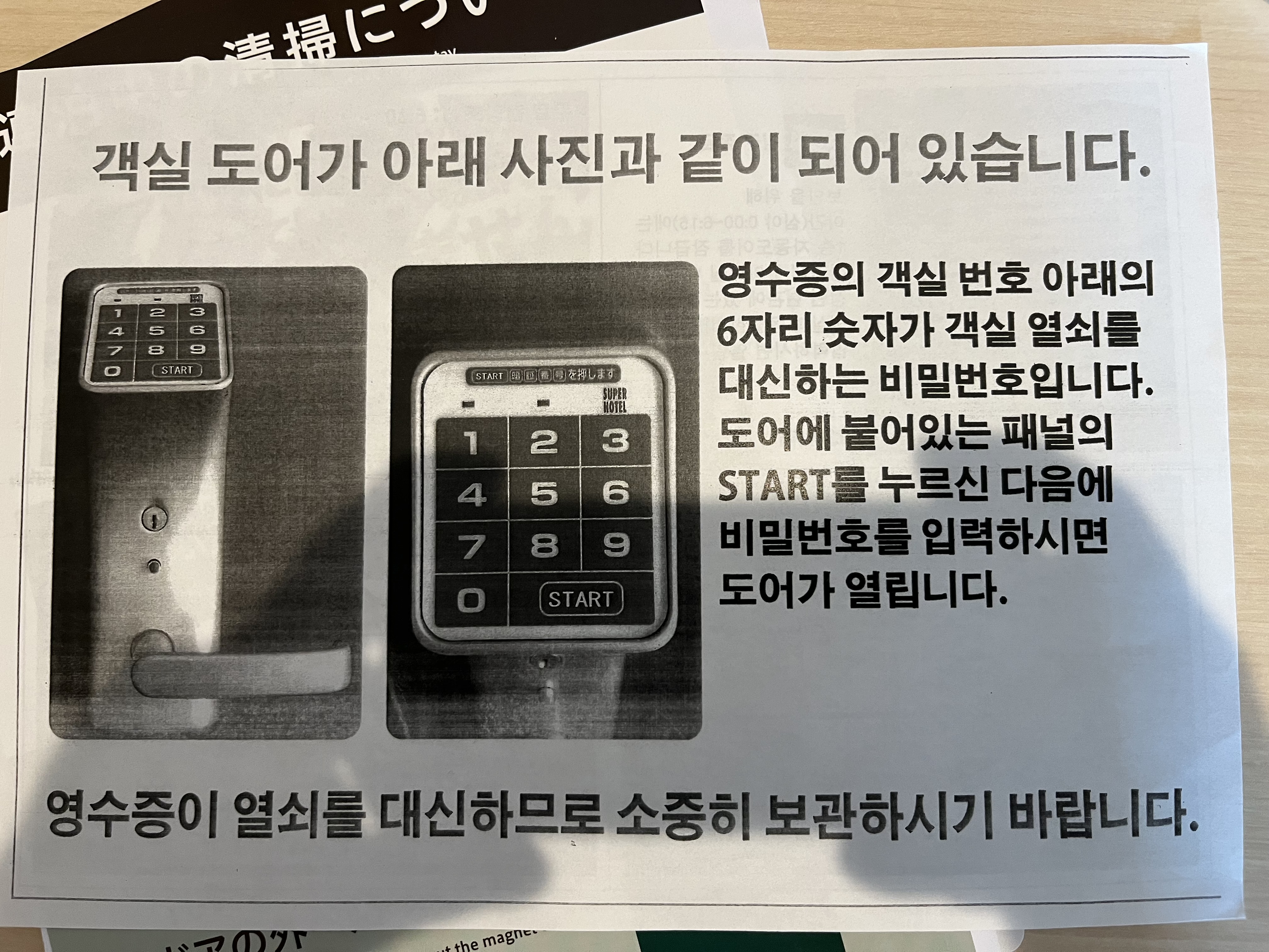 객실 도어락 사용법도 같이 준다.(호텔키 대신 암호가 적혀 있는 종이를 준다.)