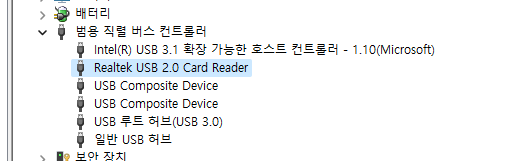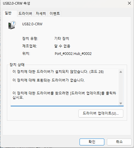 USB2.0-CRW 드라이버가 설치가 안되어 느낌표가 떠 있는 경우가 있다.