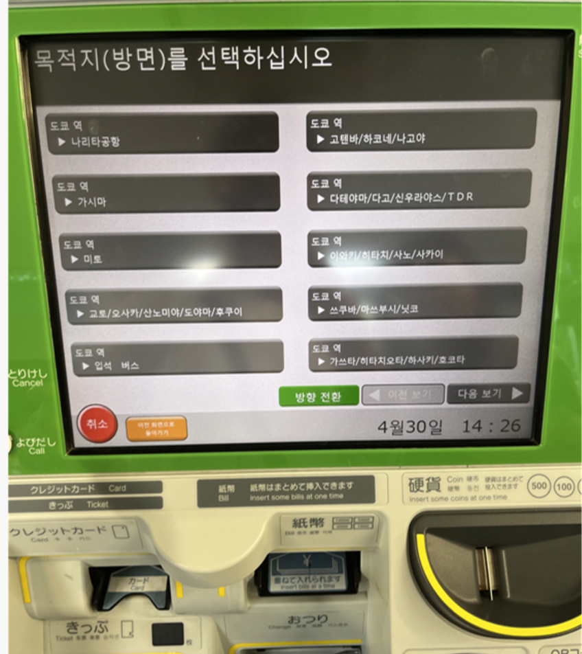 이렇게 나리타 공항 가는 버스 티켓을 판다 카드 넣는곳이 있지만 내가 가지고 있는 토스카드는 결제아 안되었다.