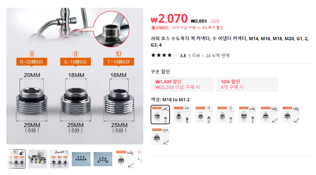 이것처럼 양쪽이 똑같은 형태라면 모르는데 새로산 수전은 원터치(?) 형태라 맞는 형태를 한국에서 구하기 어려웠다.