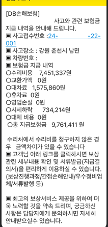 총 수리비가 745만원정도 나왔고 시세하락 73만원정도 나왔다. 10%가 왜 아니지? 뭐.. 여튼..