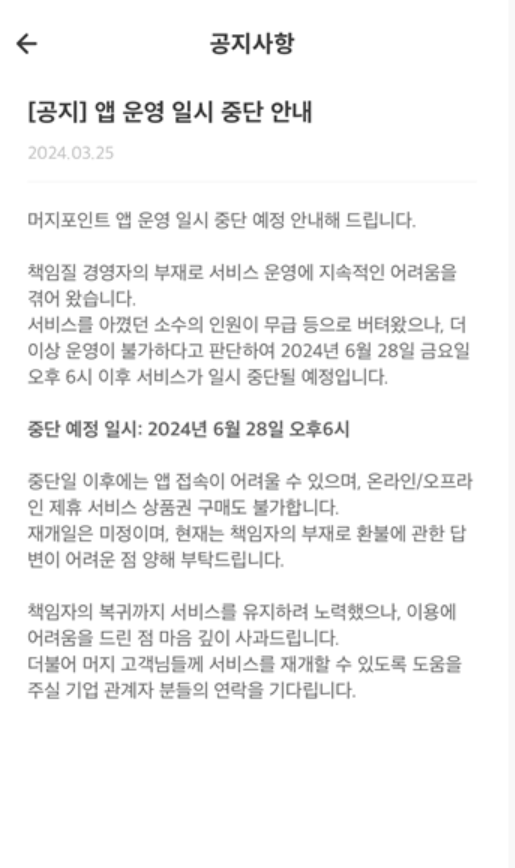 어느날 갑자기 생각이 나서 머지포인트 앱에 들어가봤다. 3월 25일날 공지가 하나 올라왔는데