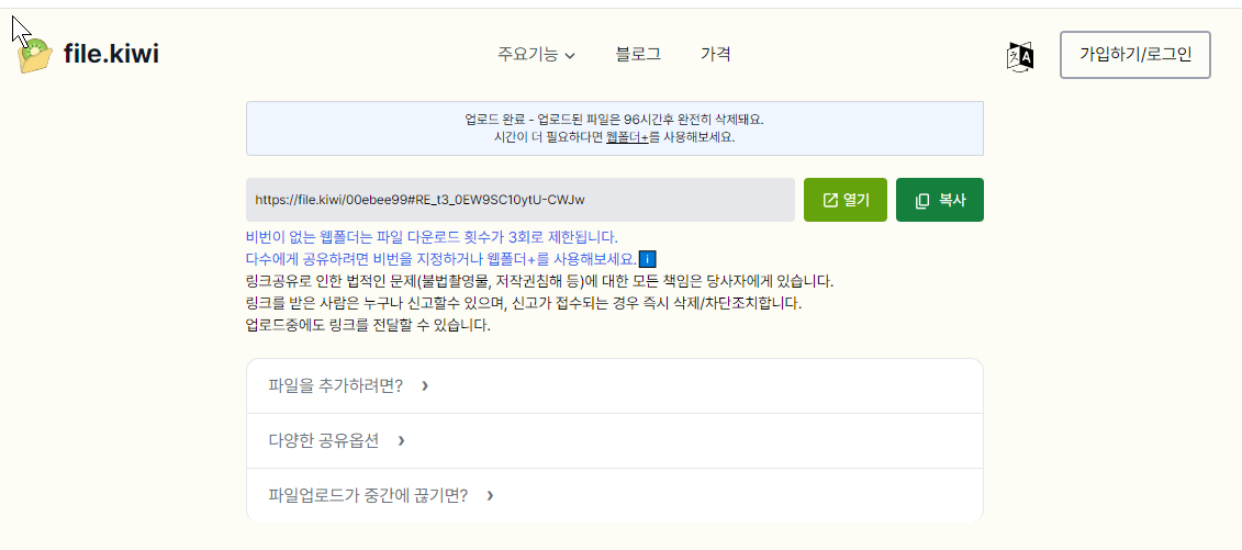 단점이 하나 있긴 한데.. 파일의 수명은 90시간이다. 짧긴 한데 뭐 3.75일정도라 몇일 공유용으로는 괜찮을듯 하다.