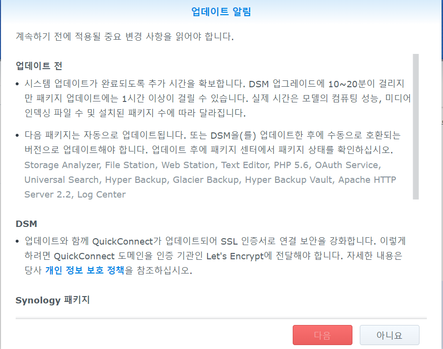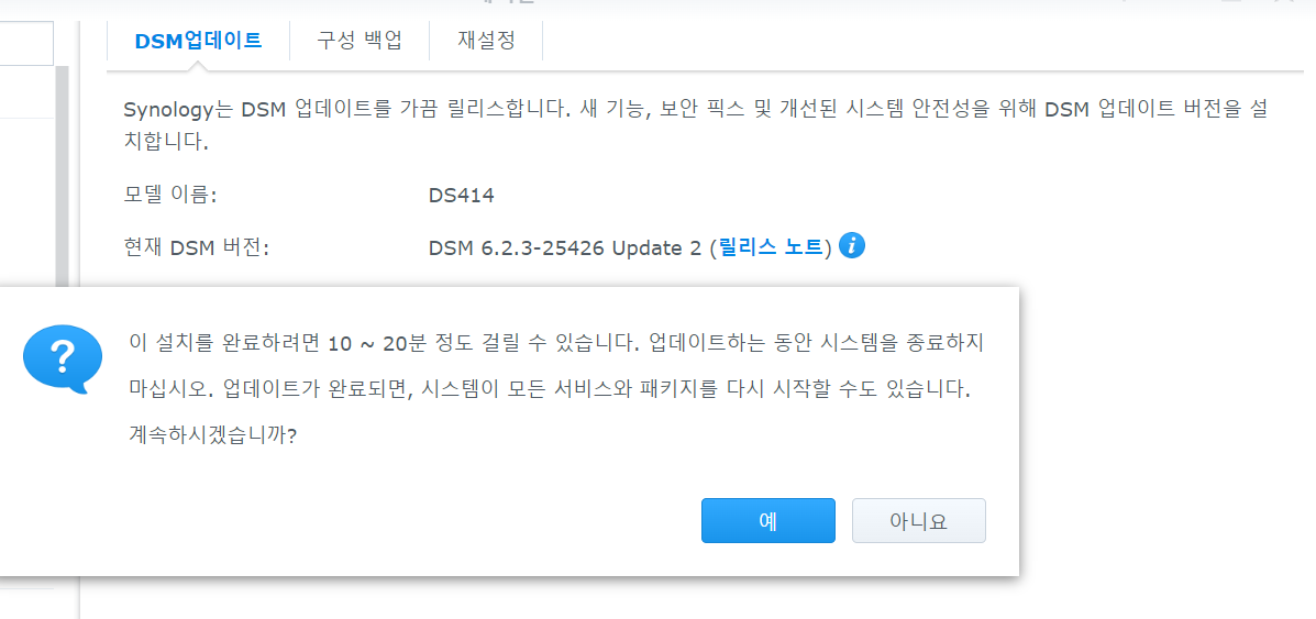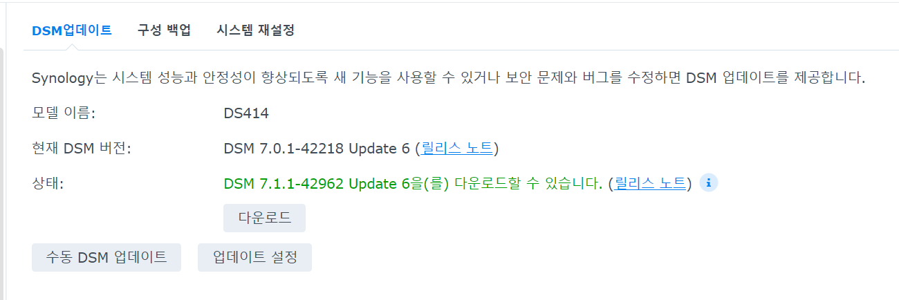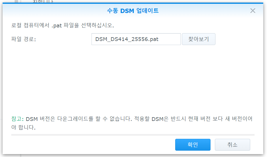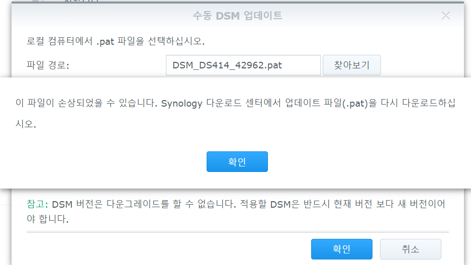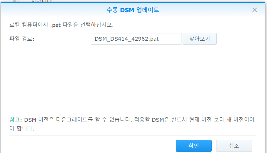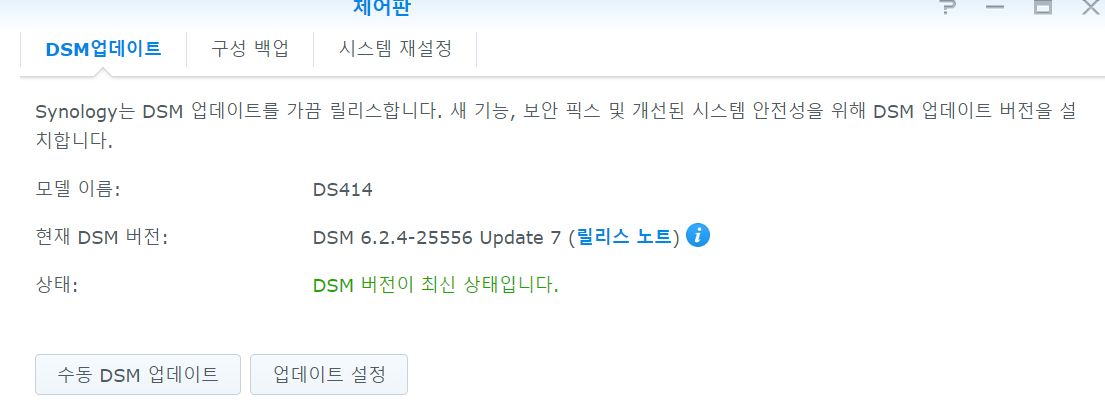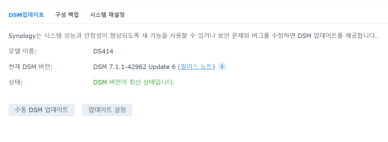 DSM 버전을 업그레이드 하려하니 최신 버전이라고 하면서 업그레이드가 안된다.