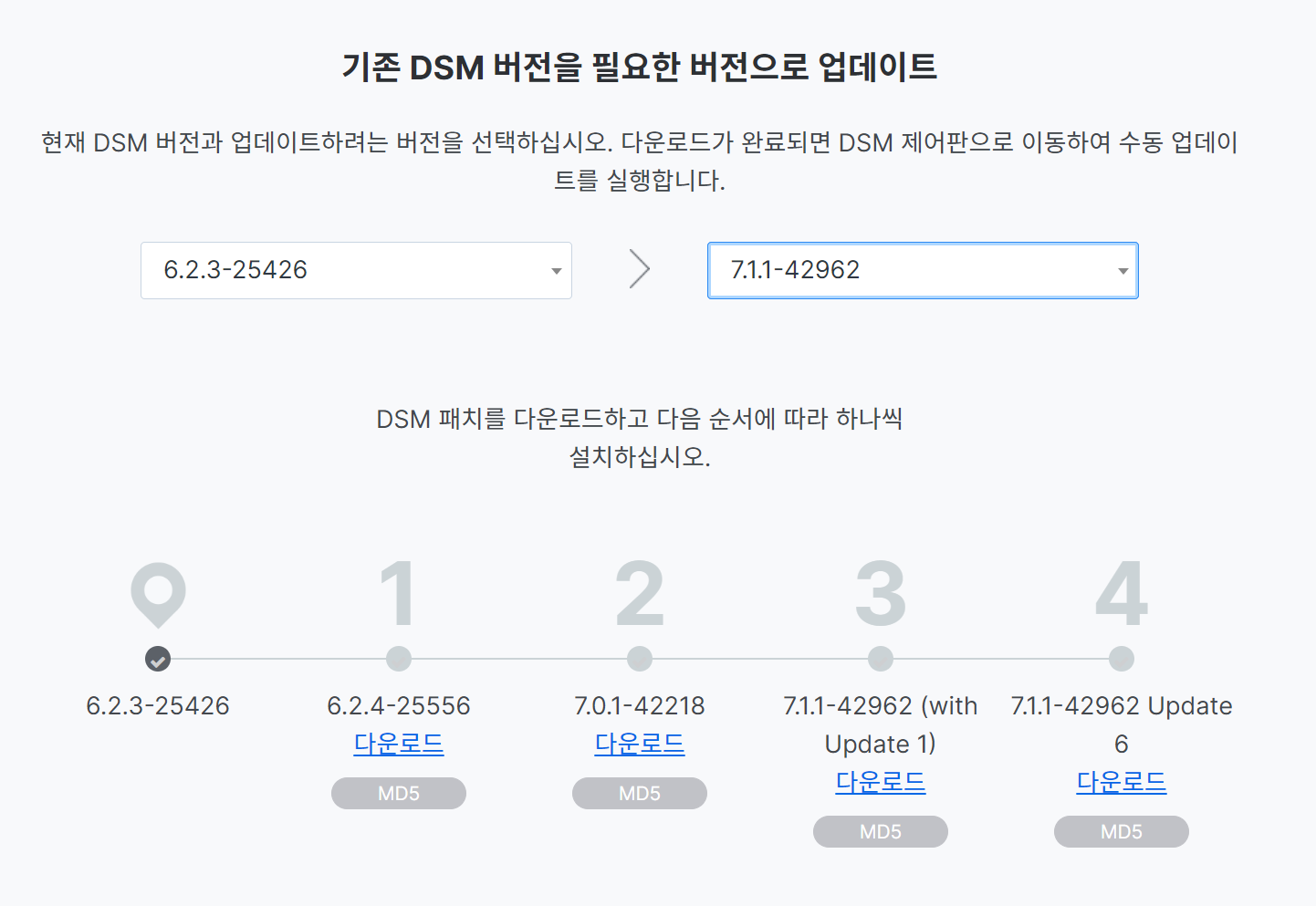 위 사이트에 가서 DSM 버전을 다운 받아서 설치 해보자.