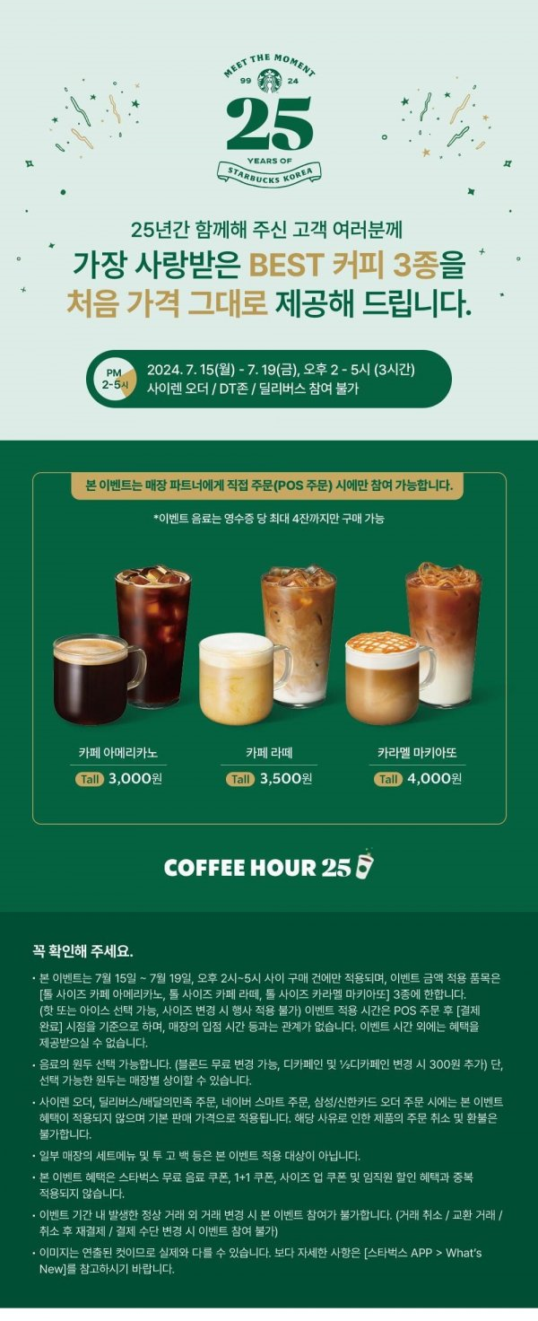 스타벅스 25주년 가장 사랑받은 Best 커피 3종을 처음 가격 그대로 제공~