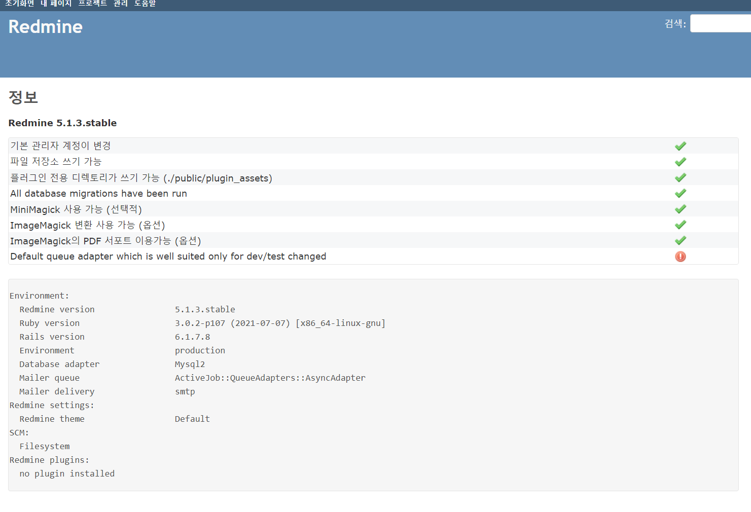 bitnami redmine 4.2.1-3 centos7에 설치redmine 수동으로 설치 하다가 여러가지 문제가 있어서 bitnami 로 설치를 했다.역시 설치가 간편하다. 하지만 단점은 redmine 이 5.x 버전이 최신인데 bitnami 로 설치