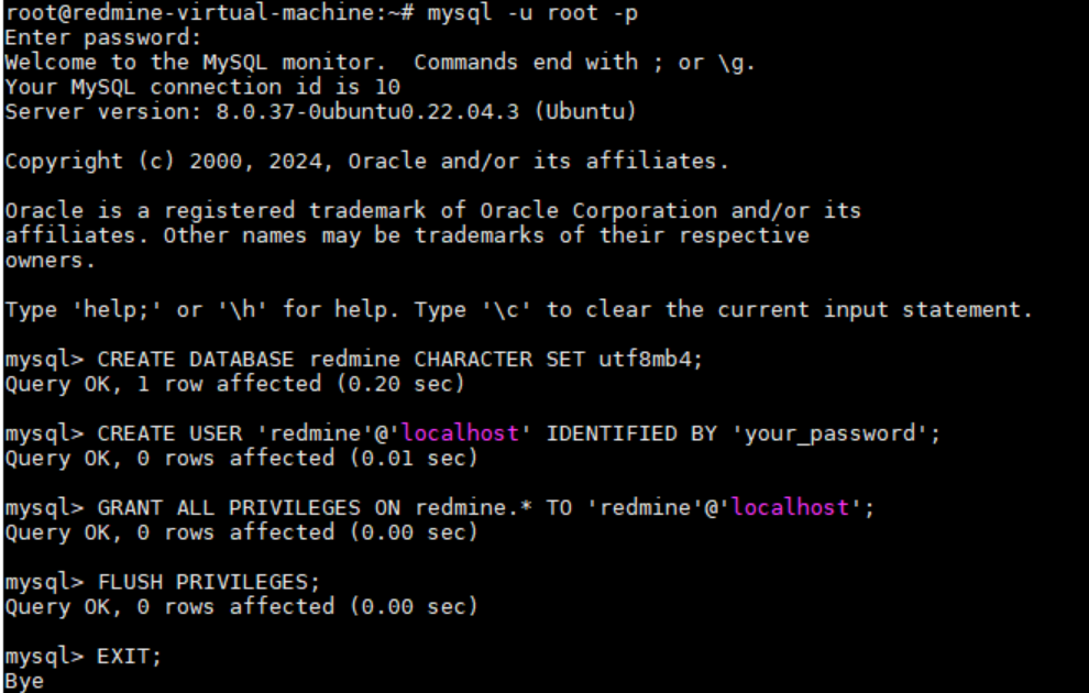 GRANT ALL PRIVILEGES ON redmine.* TO 'redmine'@'localhost';