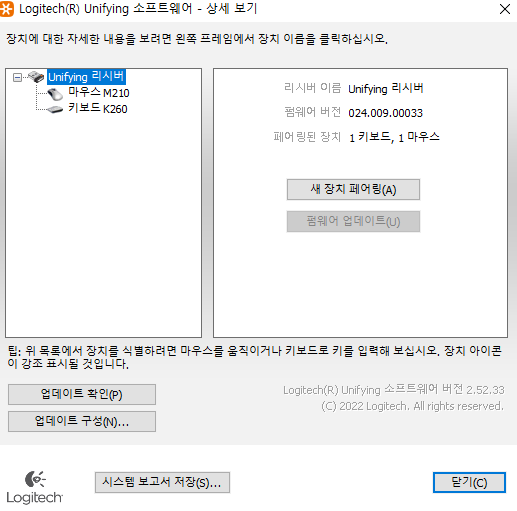 로지텍 키보드 마우스 리시버 연결이 문제가 있거나 잃어버렸을때 다시 연결하면 된다. https://support.logi.com/hc/en-my/articles/360025141574 둘중 하나 다운 받아서 구동시키면 전원 온오프 해주면 자동으