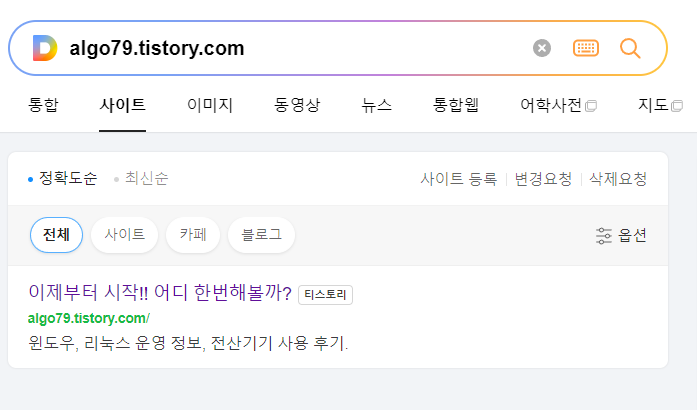 저품질? 블로그 확인 방법은 다음 검색창에 내 블로그 주소를 입력하거나 글 올린 내용을 검색을 해봤을때 검색이 되냐 안되냐로 확인이 가능하다.