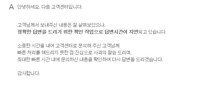 오전에 문의 했는데 오후 1시쯤에 답변이 달렸다. 오~ 매크로 답변이 아닌 확인 작업을 한다고 한다.