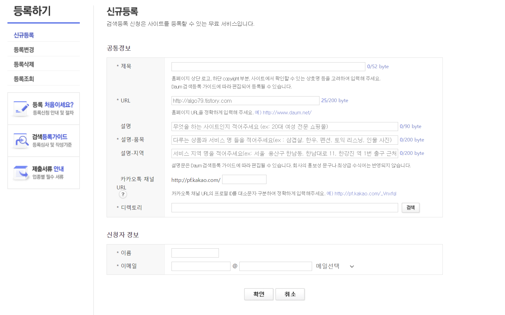 Daum 검색등록 사이트 검색을 무료로 등록할 수 있는 서비스입니다. 언제든 정보보완 수정이 가능하며, 등록 후에는 Daum 검색결과에 노출되어 수많은 네티즌들이 방문하게 됩니다. 신규등록하기