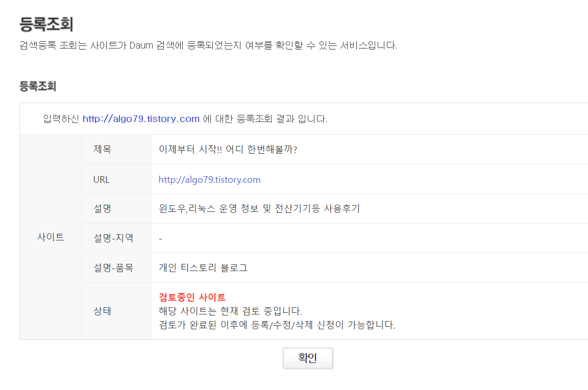 조회 해보면 검토중인 사이트로 뜬다. 하루 정도면 검토가 끝난다.