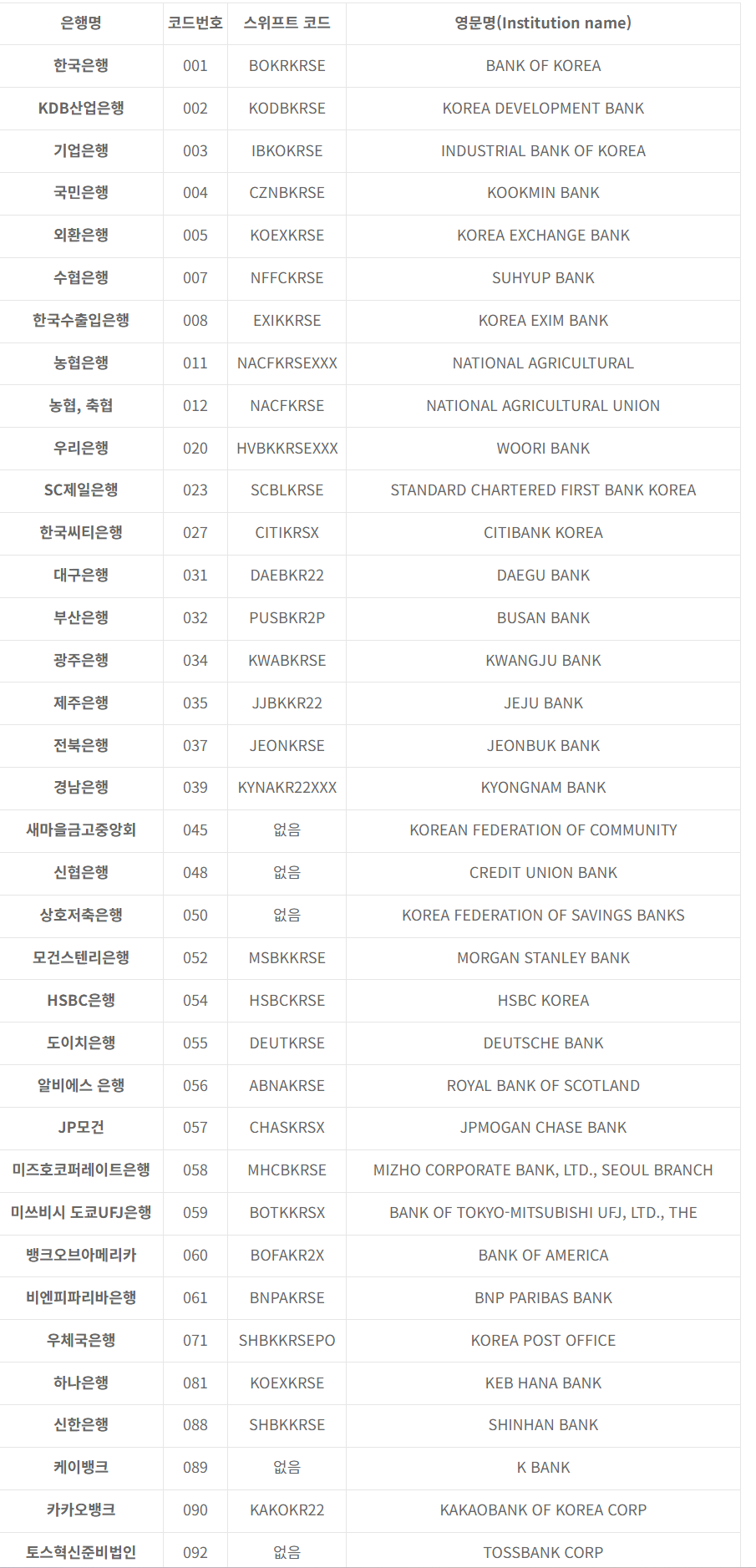 이렇게 은행이름 선택하면 코드가 자동으로 입력 된다.