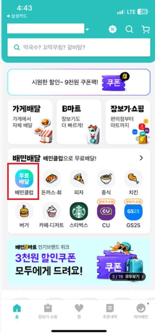 쿠폰함에 들어가보니 배민클럽 가입기념 쿠폰이 있다.