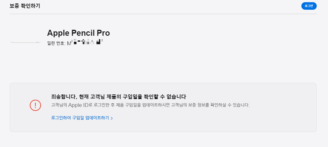 현재 고객님 제품의 구입일을 확인할 수 없습니다. 라고 뜬다.
