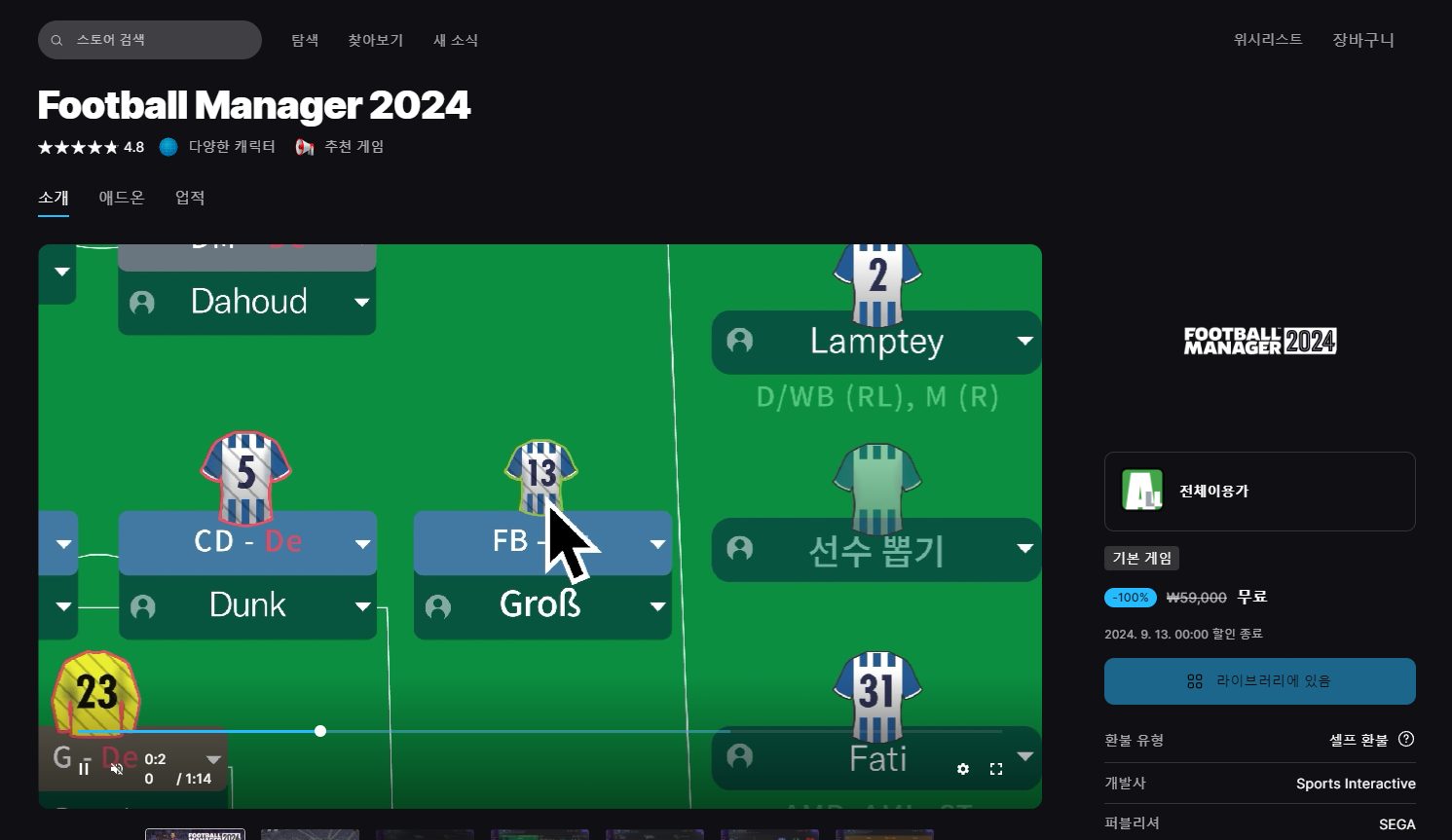 에픽게임즈에서 Football Manager 2024 무료 배포중이다!