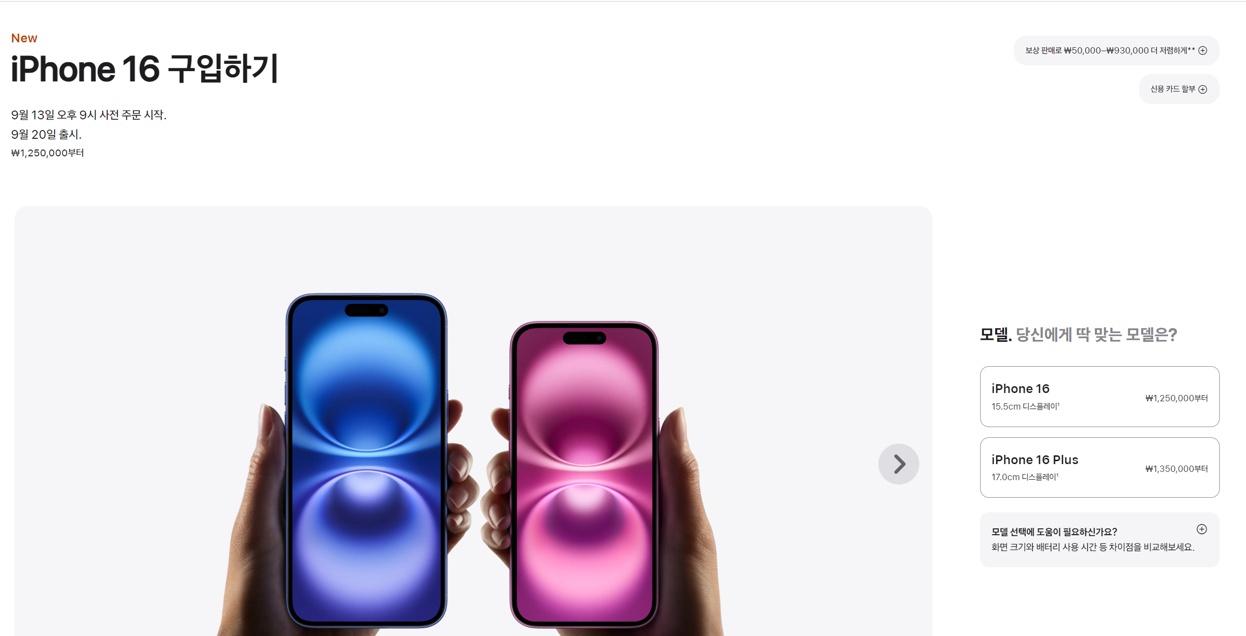 아이폰 16은 15와 동일한 가격인 125만원부터